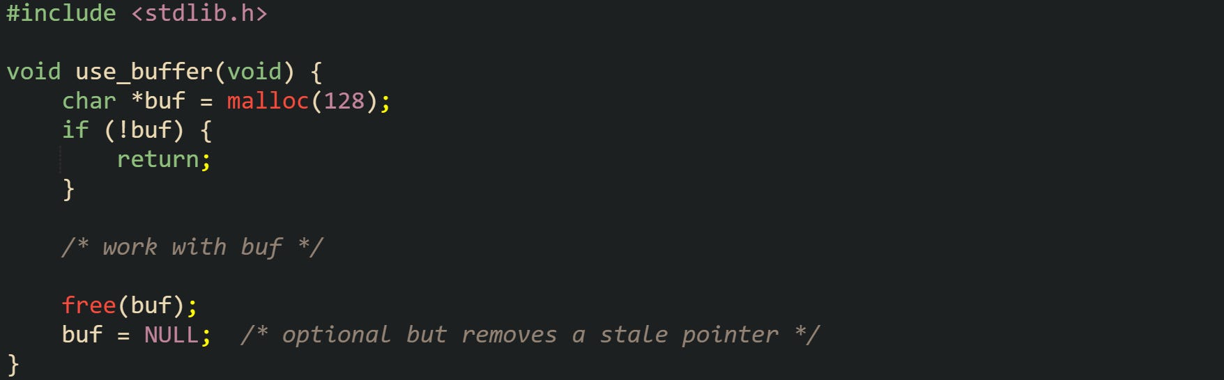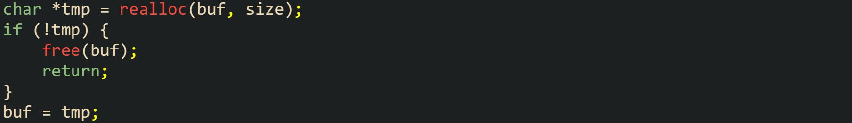 ![#include <stdlib.h> void grow_buffer(void) { size_t size = 16; char *buf = malloc(size); if (!buf) { return; } /* ... write data ... */ size = 32; char *new_buf = realloc(buf, size); if (!new_buf) { free(buf); return; } /* bad: buf is used after realloc */ buf[0] = 'X'; /* buf may now be invalid */ new_buf[1] = 'Y'; } #include <stdlib.h> void grow_buffer(void) { size_t size = 16; char *buf = malloc(size); if (!buf) { return; } /* ... write data ... */ size = 32; char *new_buf = realloc(buf, size); if (!new_buf) { free(buf); return; } /* bad: buf is used after realloc */ buf[0] = 'X'; /* buf may now be invalid */ new_buf[1] = 'Y'; }](https://substackcdn.com/image/fetch/$s_!-fLV!,w_2400,c_limit,f_auto,q_auto:good,fl_progressive:steep/https%3A%2F%2Fsubstack-post-media.s3.amazonaws.com%2Fpublic%2Fimages%2Fb859c9f9-8980-49d4-86ea-b394615a7184_1760x770.png)