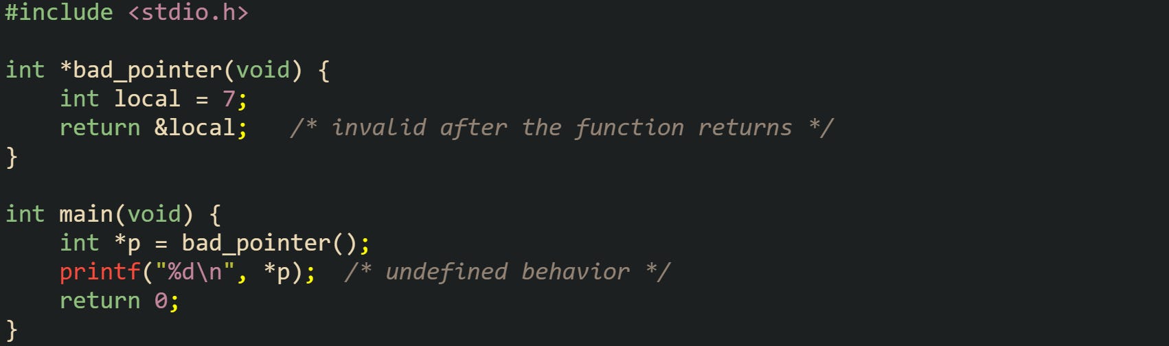 Returning a pointer to stack storage breaks lifetime rules, and compilers cannot reliably stop that mistake at compile time: