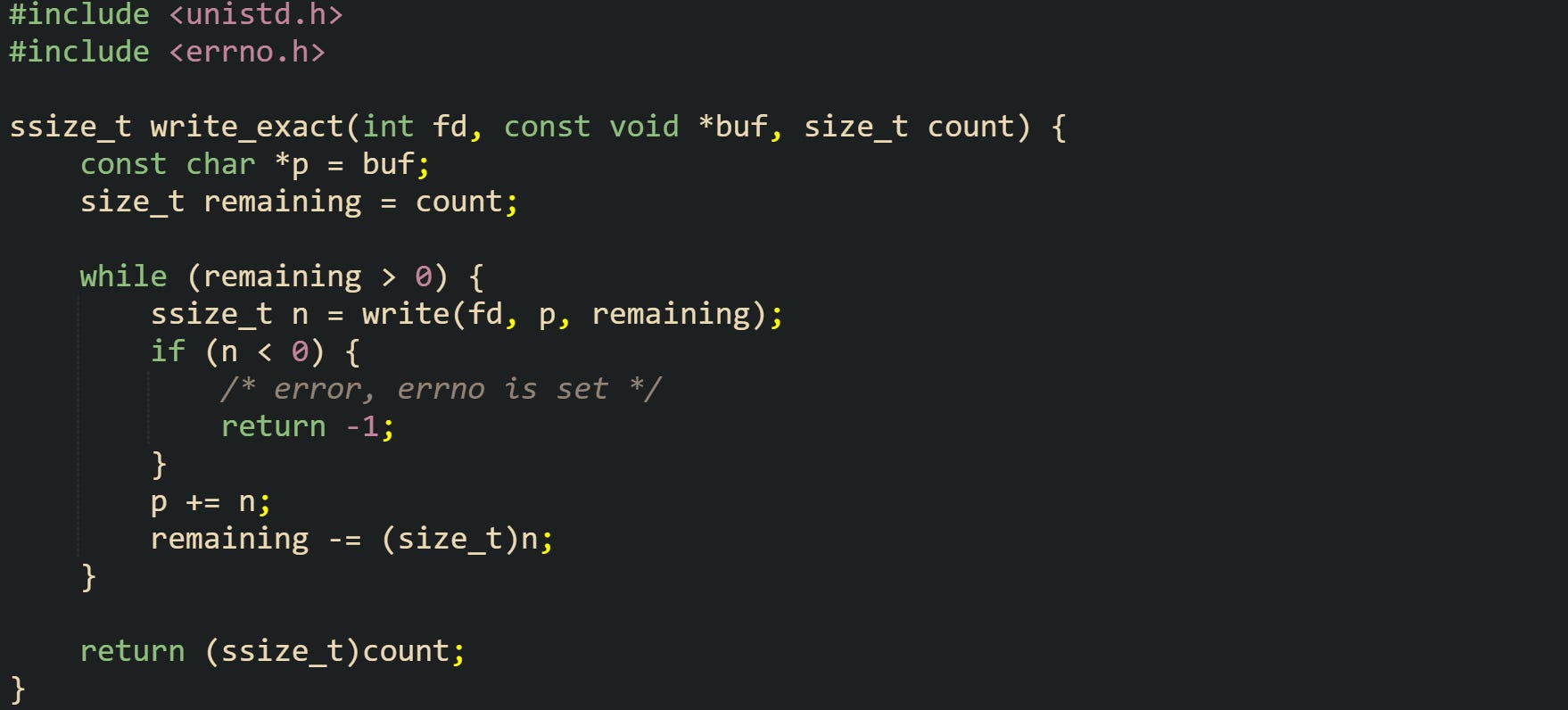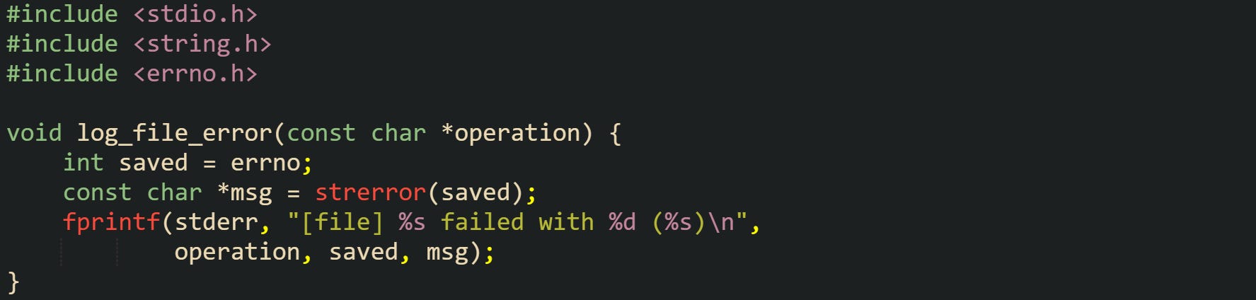 ![#include <stdio.h> #include <string.h> #include <errno.h> void log_file_error(const char *operation) { int saved = errno; const char *msg = strerror(saved); fprintf(stderr, "[file] %s failed with %d (%s)\n", operation, saved, msg); } #include <stdio.h> #include <string.h> #include <errno.h> void log_file_error(const char *operation) { int saved = errno; const char *msg = strerror(saved); fprintf(stderr, "[file] %s failed with %d (%s)\n", operation, saved, msg); }](https://substackcdn.com/image/fetch/$s_!sGYH!,w_1456,c_limit,f_auto,q_auto:good,fl_progressive:steep/https%3A%2F%2Fsubstack-post-media.s3.amazonaws.com%2Fpublic%2Fimages%2F8289a714-0318-4f9a-8f63-f3f7f5a7712b_1775x424.png)