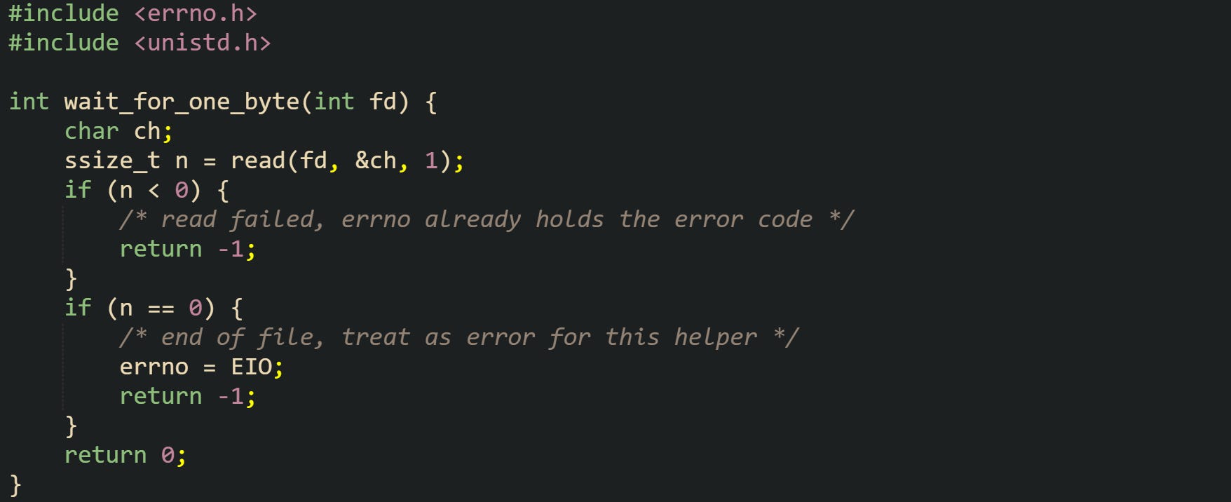This helper sets no new error code when read succeeds and returns zero. The original errno from the caller remains untouched in that case. When read fails with a negative result, errno already contains a code such as EINTR, EIO, or EBADF. When end of file appears where this helper expects more data, the helper assigns EIO so callers can see a consistent signal that the stream closed too early.