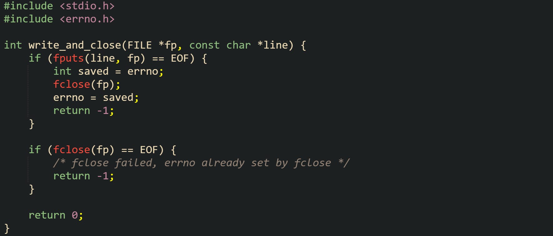 Here, the helper preserves the error from fputs while still closing the stream. The caller that checks the return value and then reads errno after a failure will see the error code that caused the write to stop, not a later one that came from fclose. That small pattern of saving and restoring errno helps keep error messages accurate when several functions run as part of one higher level operation.