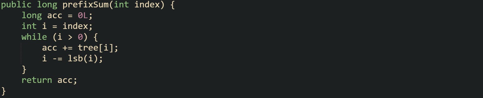 ![public long prefixSum(int index) { long acc = 0L; int i = index; while (i > 0) { acc += tree[i]; i -= lsb(i); } return acc; } public long prefixSum(int index) { long acc = 0L; int i = index; while (i > 0) { acc += tree[i]; i -= lsb(i); } return acc; }](https://substackcdn.com/image/fetch/$s_!ccOh!,w_2400,c_limit,f_auto,q_auto:good,fl_progressive:steep/https%3A%2F%2Fsubstack-post-media.s3.amazonaws.com%2Fpublic%2Fimages%2Feeff62d4-c87d-4d72-a85a-18b82ecfc0b5_1554x318.png)