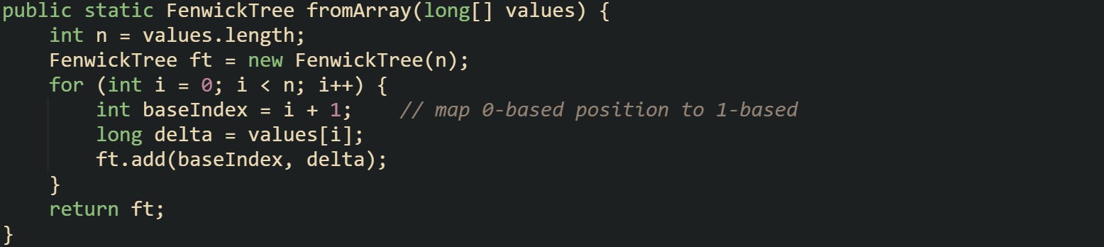 ![public static FenwickTree fromArray(long[] values) { int n = values.length; FenwickTree ft = new FenwickTree(n); for (int i = 0; i < n; i++) { int baseIndex = i + 1; // map 0-based position to 1-based long delta = values[i]; ft.add(baseIndex, delta); } return ft; } public static FenwickTree fromArray(long[] values) { int n = values.length; FenwickTree ft = new FenwickTree(n); for (int i = 0; i < n; i++) { int baseIndex = i + 1; // map 0-based position to 1-based long delta = values[i]; ft.add(baseIndex, delta); } return ft; }](https://substackcdn.com/image/fetch/$s_!xpQ9!,w_2400,c_limit,f_auto,q_auto:good,fl_progressive:steep/https%3A%2F%2Fsubstack-post-media.s3.amazonaws.com%2Fpublic%2Fimages%2F3ec745bd-bd7c-4020-baa6-782506510560_1556x348.png)