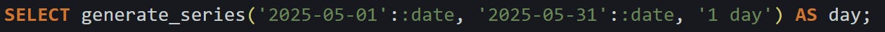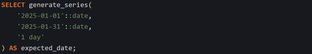If you’re using PostgreSQL, the generate_series function makes this fast. Say you expect a row every day from January 1 to January 31 in 2025. You’d start by building the full range of days like this: