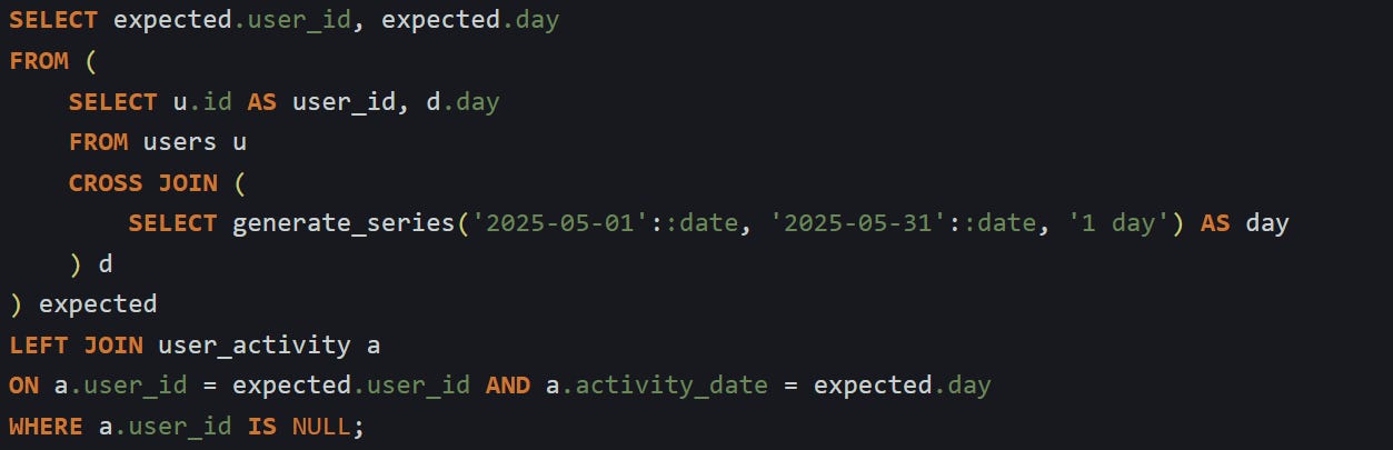 Now you’ll get a list of users and days where there was no activity. It’s the same pattern: build the full set, join to the real data, and find what’s missing. You can apply this to any pair or combination of columns. The only requirement is that you know what the full set is supposed to look like so you can generate it.