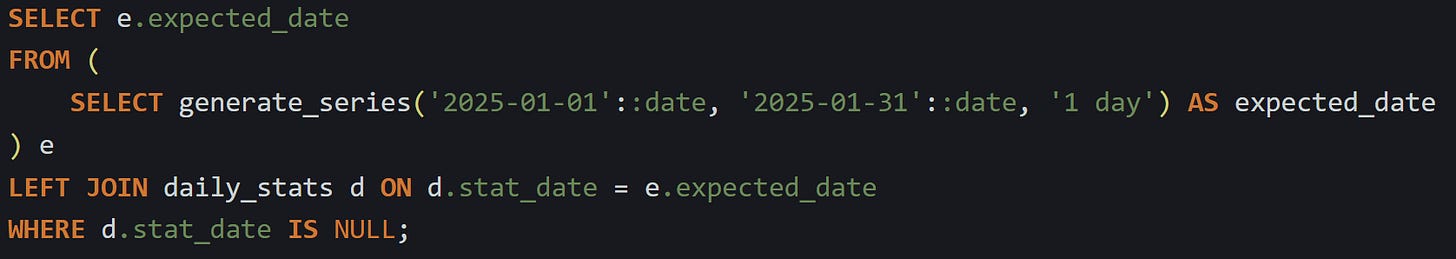 That’s the same pattern. You create the list of what should be there, then use a left join to check which dates were never written to the table. This works for data stored daily, hourly, or even every few seconds. You just adjust the step size in generate_series or INTERVAL. The strength of this method comes from the fact that it doesn't rely on what’s already in the table. It starts fresh with what’s expected, then compares.