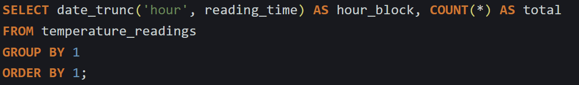 Say you have a table that records temperature readings from a device, and you want to check activity by hour. Your table looks like this: