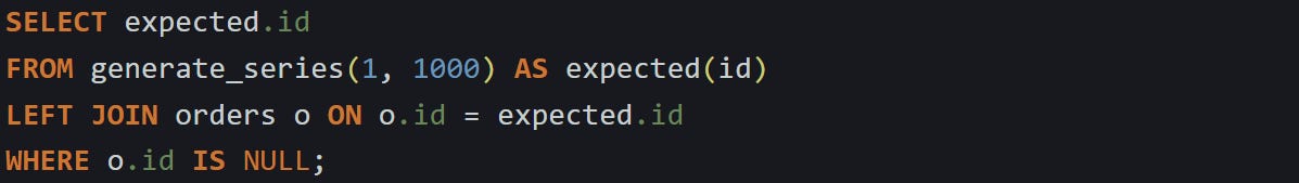 This trick depends on how SQL joins work, not on a special feature. A left join includes all rows from the left side of the query, and then tries to match them to the right side. If it can’t find a match, the fields from the right table come back as null. That’s exactly what makes this pattern useful. When you generate the expected values on the left and join them to real data on the right, the nulls point out where the match didn’t happen. That’s your missing entry. So if a date or ID from your expected set has no corresponding row in the actual table, it comes back with nulls and is easy to filter.