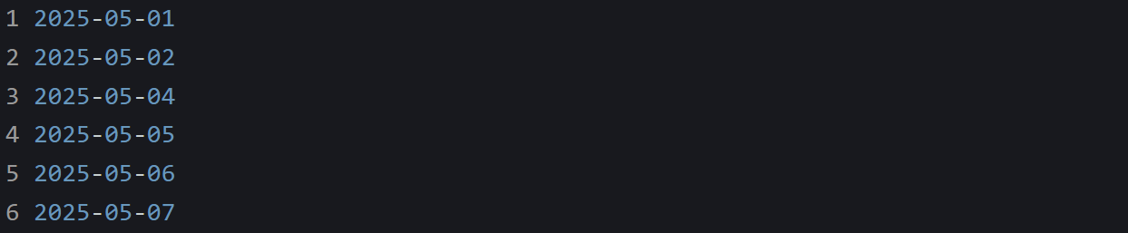 Say your application stores one summary row per day. You want to check what data exists for the first week of May 2025. You run this: