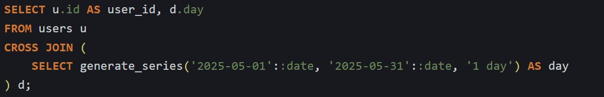 Sometimes it’s not just a missing date or ID. Some tables depend on combinations of values. A good example is when you expect one row per user per day. You can’t just generate a list of dates. You need to build every pair of (user_id, date) and compare that to what the table actually holds.