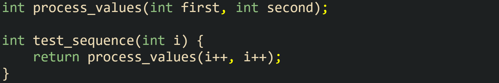 Both arguments to process_values update i, and because the two increments are not sequenced with respect to each other, the C standard treats this call as undefined behavior rather than as a valid call with an unspecified order. Code that relies on that expression is not valid C, so the compiler is free to assume it never happens and the program can misbehave in ways that go beyond returning different values from test_sequence. Safer code in that situation updates i in a separate statement, or uses distinct temporary variables, so each argument to a function call touches shared state no more than one time.