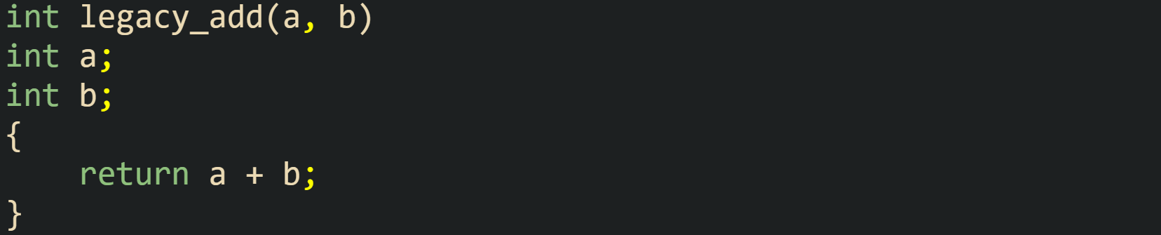This form describes legacy_add as a function that takes two int parameters and returns an int, but the syntax splits the parameter list from the parameter declarations. Modern C places parameter types directly inside the parentheses in the function header, which makes the function type easier to read and gives the compiler all the type information at one point. When working with mixed codebases where some files still use this style, developers typically migrate toward prototypes as code is updated, so every call site has an explicit declaration available.
