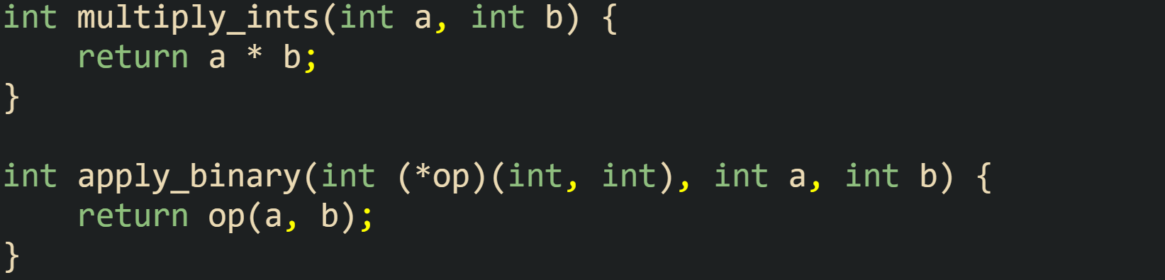 The type int (*op)(int, int) means pointer to function that takes two int values and returns an int. Assigning multiply_ints to a variable of that type stores the address of the compiled code for multiply_ints. When apply_binary runs, it receives that address as a parameter, sets up the arguments according to the ABI for the platform, and then performs an indirect call through op. The result comes back in the ordinary return register, and apply_binary passes it along to its own caller.