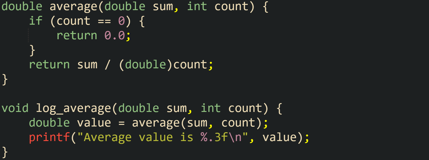 The function average has return type double, so every return statement in its body must carry an expression that can be converted to double. In the first branch the literal 0.0 already has type double. In the second branch the expression sum / (double)count has type double after the cast, so it also matches the return type. The caller log_average treats average(sum, count) as an expression of type double, assigns that value to value, and passes it along to printf. A function with nonvoid return type that reaches the closing brace of its body without executing a return statement has undefined behavior according to the C standard, so compilers warn about such functions when warnings are enabled. One special case is main, where reaching the end of the function has the same effect as return 0; in modern C standards.
