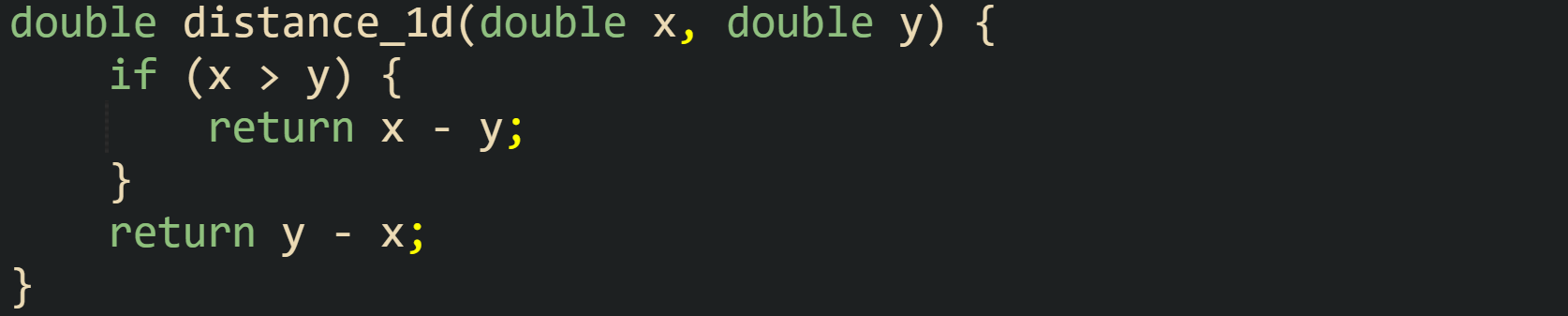 This returns its double value in a floating point or vector register that ABI documents specify, such as XMM0 on x86 64 or V0 on AArch64. Callers treat that register as holding the result, so a call expression to distance_1d slots naturally into larger floating point expressions in C.