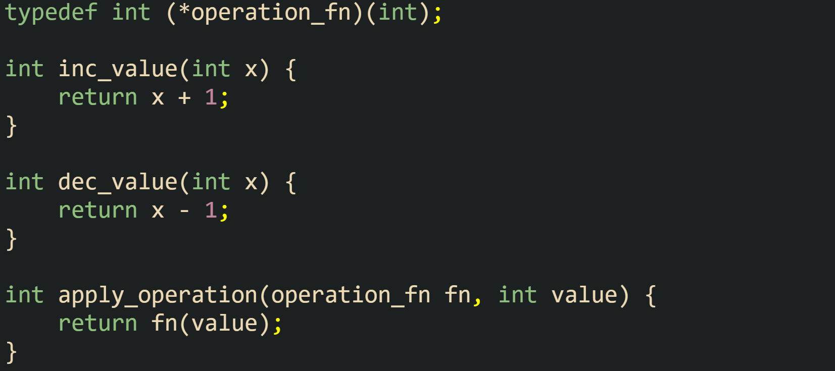 With this setup, client code can store addresses of inc_value and dec_value in variables or arrays of operation_fn and choose which function to call based on user input, configuration, or data values. The ABI does not change for indirect calls. Parameter values still travel in the same registers and stack locations, and return values still arrive in the same registers, so the only difference is that the call destination is fetched from memory or a register instead of being encoded as a fixed address in the instruction stream.