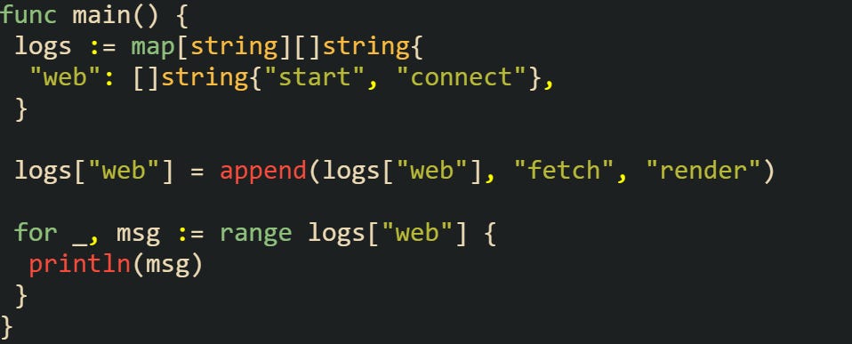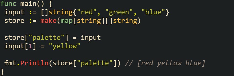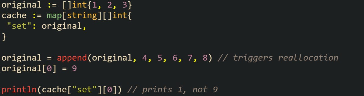 This works because the original capacity allowed for the slice to grow without reallocating. If the capacity had been reached earlier, Go would’ve created a new array behind the scenes. At that point, any other references to the old slice would still point to the original array, while the new one lives only inside the map.