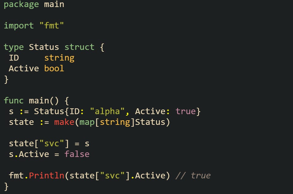 Here, s gets placed in the map with its original value. After that, the map has no connection to the s variable. Any edits to s won’t carry over, and the map stays unchanged. That separation can lead to bugs when you expect the struct in the map to reflect the latest updates. It also comes up when you try to change a field directly on a struct inside the map. Go doesn’t allow it, and the compiler throws an error. To make a change, you have to copy the value out, modify it, then store it back in. That extra step makes sense once you realize you’re no longer working with the original value.
