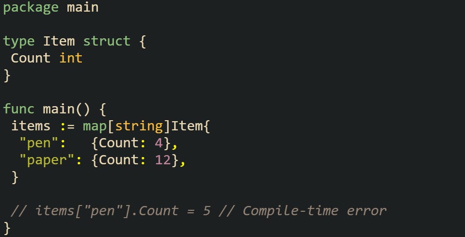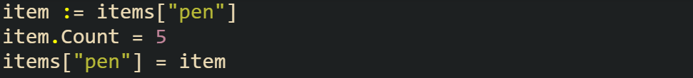 The items["pen"] gives you a copy of the struct, and you can’t change a field on it directly. The compiler shuts it down because the value isn’t addressable inside the map context.