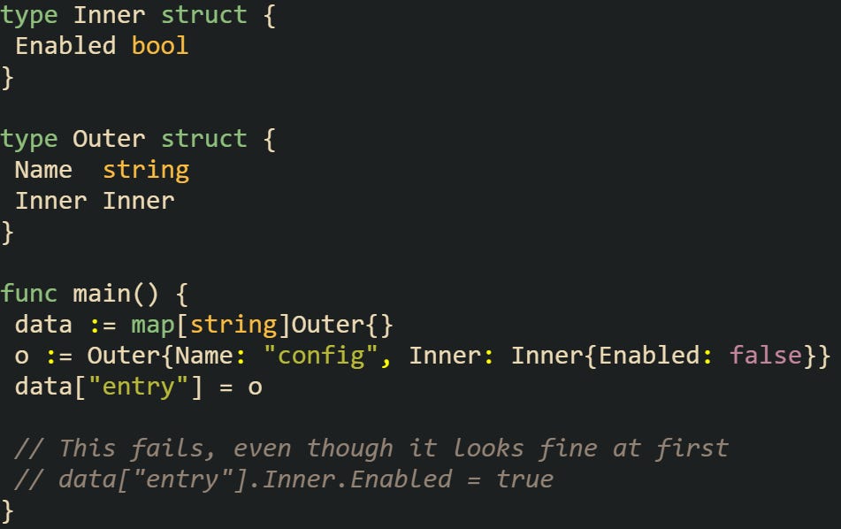 This applies to more than just updates. If you’re looping over a map of structs and try to update fields during that loop, you’ll end up working with temporary copies. Any change made that way won’t stick unless you take the value out, update it, and store it back.