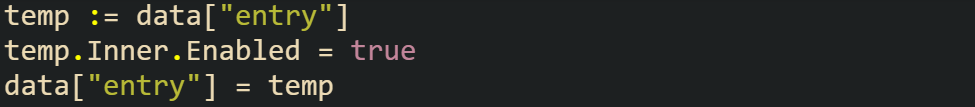 The attempt to flip the Enabled flag directly on the map entry fails, not because of the field itself, but because data["entry"] returns a full copy of Outer. The compiler won’t let you update part of that copy. Just like with the previous case, you have to pull out the value, change it, and then push it back in.