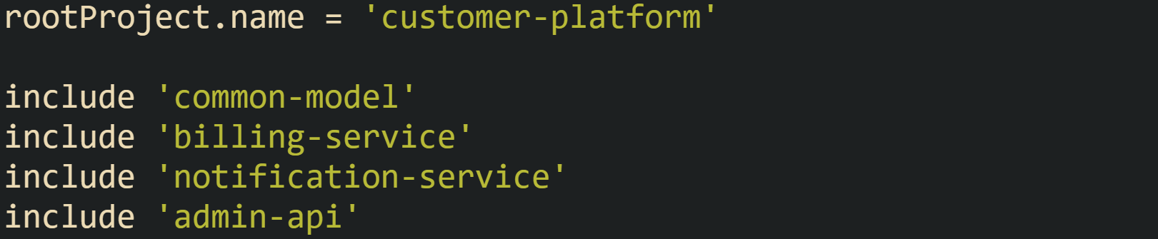 Gradle now knows it has four subprojects plus the root project. During the configuration phase it will read build.gradle for common-model, billing-service, notification-service, admin-api, and the root project, apply the declared plugins, and register all the build actions that those scripts define.