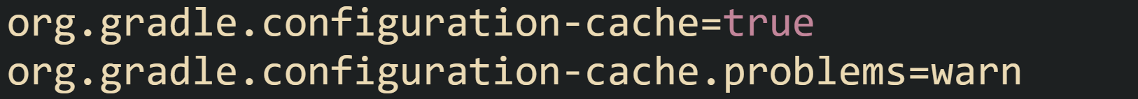 A simple Gradle 9 gradle.properties file in the root project can turn configuration cache on and give Gradle permission to log problems as warnings during a migration period.