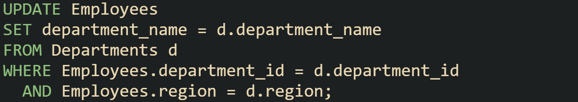 Sometimes it’s helpful to use multiple conditions in the join. Maybe an employee can belong to more than one department based on region, and you want to make sure you update the right one.