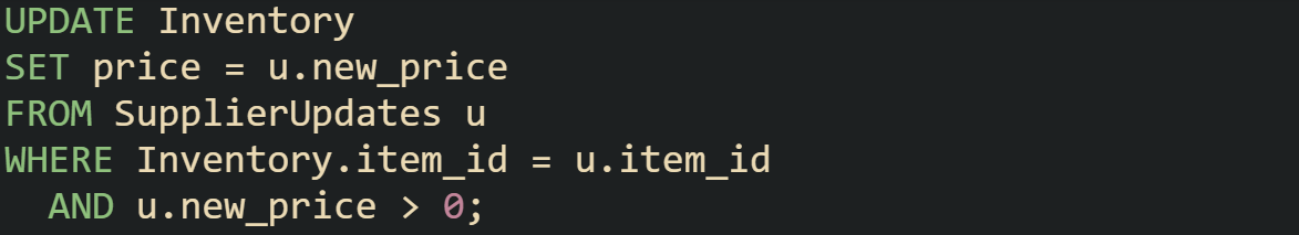 The join still provides the connection, but the added condition in the WHERE clause restricts the updates to products marked as active. Rows that don’t meet the condition are skipped.