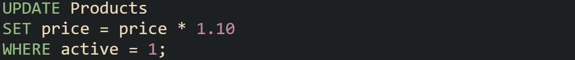 Now, when you involve another table, the work changes a little. The database must line up rows across tables before it can make the update. Let’s say you have a Products table and a separate PricingAdjustments table that holds updated prices from a supplier.