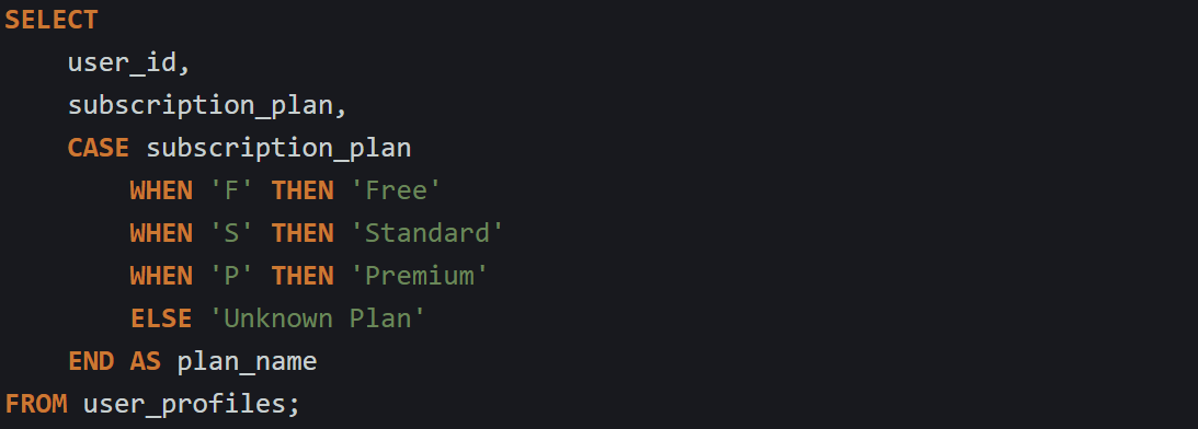 A simple CASE works a bit differently. Instead of writing full conditions, you give SQL a single value to compare against, and then write possible matches. Think of it like a switch statement in other languages.