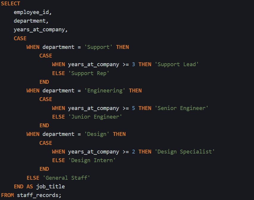 Sometimes a decision depends on a second detail that only matters once the first condition is already met. That’s where nesting comes in. You can put a full CASE expression inside another, usually inside a THEN