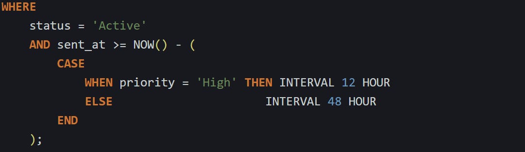 This means that high-priority messages get a tighter window, while others use a wider one. Without CASE, you’d have to write multiple queries or UNION different conditions, which isn’t always efficient or clean.