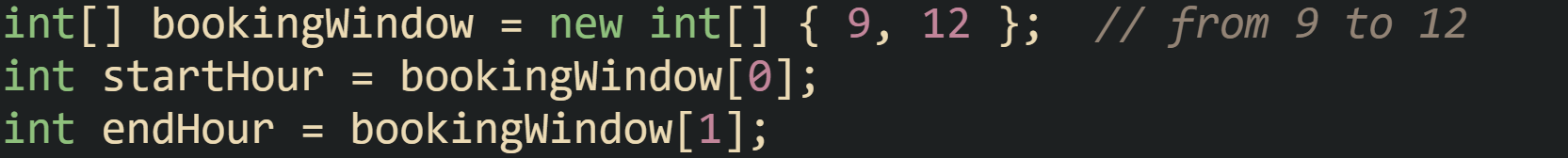 ![int[] bookingWindow = new int[] { 9, 12 }; // from 9 to 12 int startHour = bookingWindow[0]; int endHour = bookingWindow[1]; int[] bookingWindow = new int[] { 9, 12 }; // from 9 to 12 int startHour = bookingWindow[0]; int endHour = bookingWindow[1];](https://substackcdn.com/image/fetch/$s_!5Dgm!,w_1456,c_limit,f_auto,q_auto:good,fl_progressive:steep/https%3A%2F%2Fsubstack-post-media.s3.amazonaws.com%2Fpublic%2Fimages%2F9675ce3a-c197-4150-90f2-ffd0b4d7f0cd_1665x168.png)