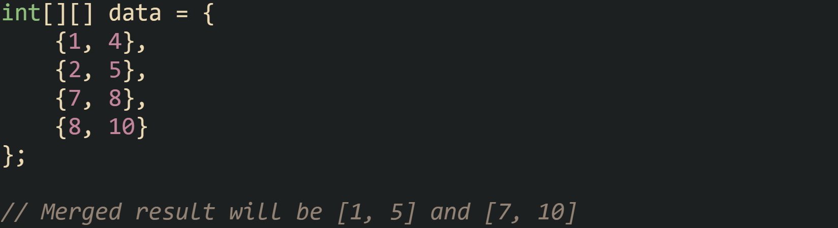 ![int[][] data = { {1, 4}, {2, 5}, {7, 8}, {8, 10} }; // Merged result will be [1, 5] and [7, 10] int[][] data = { {1, 4}, {2, 5}, {7, 8}, {8, 10} }; // Merged result will be [1, 5] and [7, 10]](https://substackcdn.com/image/fetch/$s_!99x3!,w_1456,c_limit,f_auto,q_auto:good,fl_progressive:steep/https%3A%2F%2Fsubstack-post-media.s3.amazonaws.com%2Fpublic%2Fimages%2F28454834-d7ec-4602-b805-fd74406d9de9_1649x449.png)