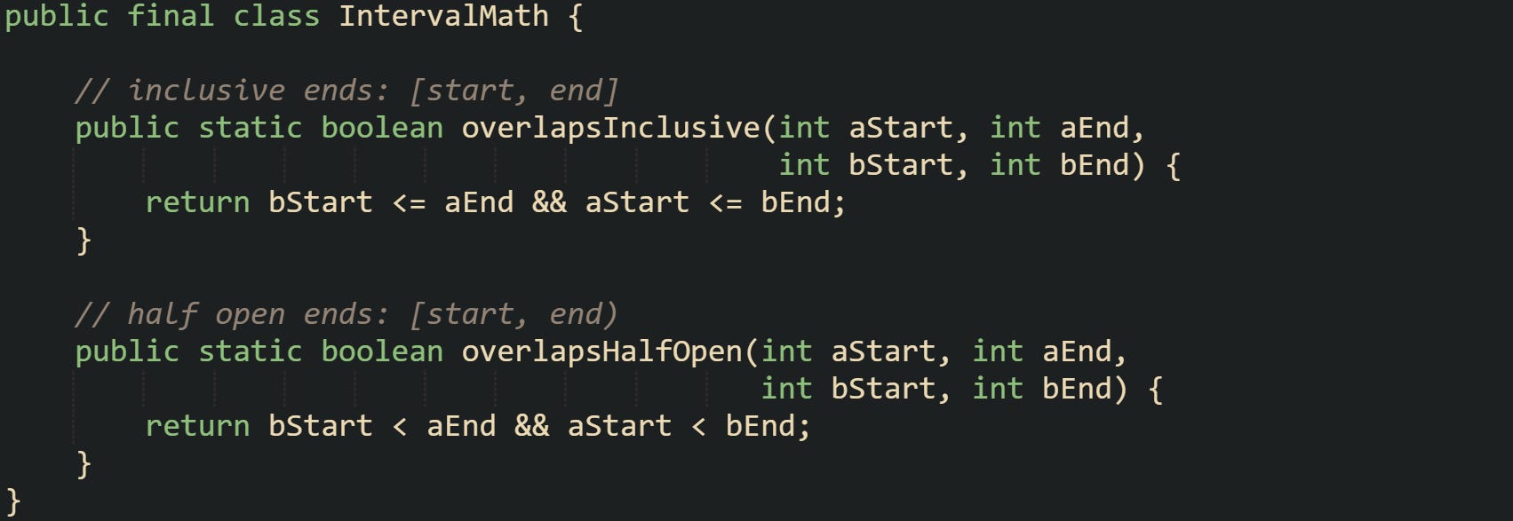 ![public final class IntervalMath { // inclusive ends: [start, end] public static boolean overlapsInclusive(int aStart, int aEnd, int bStart, int bEnd) { return bStart <= aEnd && aStart <= bEnd; } // half open ends: [start, end) public static boolean overlapsHalfOpen(int aStart, int aEnd, int bStart, int bEnd) { return bStart < aEnd && aStart < bEnd; } } public final class IntervalMath { // inclusive ends: [start, end] public static boolean overlapsInclusive(int aStart, int aEnd, int bStart, int bEnd) { return bStart <= aEnd && aStart <= bEnd; } // half open ends: [start, end) public static boolean overlapsHalfOpen(int aStart, int aEnd, int bStart, int bEnd) { return bStart < aEnd && aStart < bEnd; } }](https://substackcdn.com/image/fetch/$s_!FZSC!,w_1456,c_limit,f_auto,q_auto:good,fl_progressive:steep/https%3A%2F%2Fsubstack-post-media.s3.amazonaws.com%2Fpublic%2Fimages%2Fb74087e3-581e-43d3-b905-d5f938d8e97e_1703x587.png)