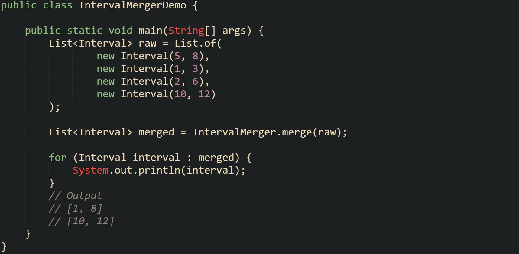 ![public class IntervalMergerDemo { public static void main(String[] args) { List<Interval> raw = List.of( new Interval(5, 8), new Interval(1, 3), new Interval(2, 6), new Interval(10, 12) ); List<Interval> merged = IntervalMerger.merge(raw); for (Interval interval : merged) { System.out.println(interval); } // Output // [1, 8] // [10, 12] } } public class IntervalMergerDemo { public static void main(String[] args) { List<Interval> raw = List.of( new Interval(5, 8), new Interval(1, 3), new Interval(2, 6), new Interval(10, 12) ); List<Interval> merged = IntervalMerger.merge(raw); for (Interval interval : merged) { System.out.println(interval); } // Output // [1, 8] // [10, 12] } }](https://substackcdn.com/image/fetch/$s_!KeOO!,w_1456,c_limit,f_auto,q_auto:good,fl_progressive:steep/https%3A%2F%2Fsubstack-post-media.s3.amazonaws.com%2Fpublic%2Fimages%2Fc16f9e56-b19b-4063-a62e-01d7accd165d_1717x840.png)