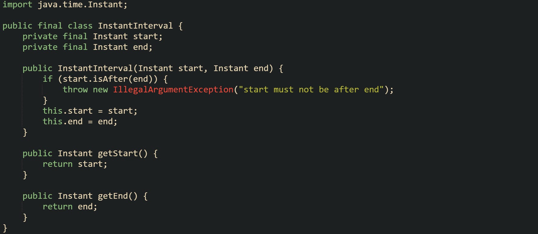 ![public final class Interval { private final int start; private final int end; public Interval(int start, int end) { if (start > end) { throw new IllegalArgumentException("start must be <= end"); } this.start = start; this.end = end; } public int getStart() { return start; } public int getEnd() { return end; } @Override public String toString() { return "[" + start + ", " + end + "]"; } } public final class Interval { private final int start; private final int end; public Interval(int start, int end) { if (start > end) { throw new IllegalArgumentException("start must be <= end"); } this.start = start; this.end = end; } public int getStart() { return start; } public int getEnd() { return end; } @Override public String toString() { return "[" + start + ", " + end + "]"; } }](https://substackcdn.com/image/fetch/$s_!eMX8!,w_2400,c_limit,f_auto,q_auto:good,fl_progressive:steep/https%3A%2F%2Fsubstack-post-media.s3.amazonaws.com%2Fpublic%2Fimages%2F346c5d44-477f-4ed8-b9c3-39a09fb69110_1778x877.png)