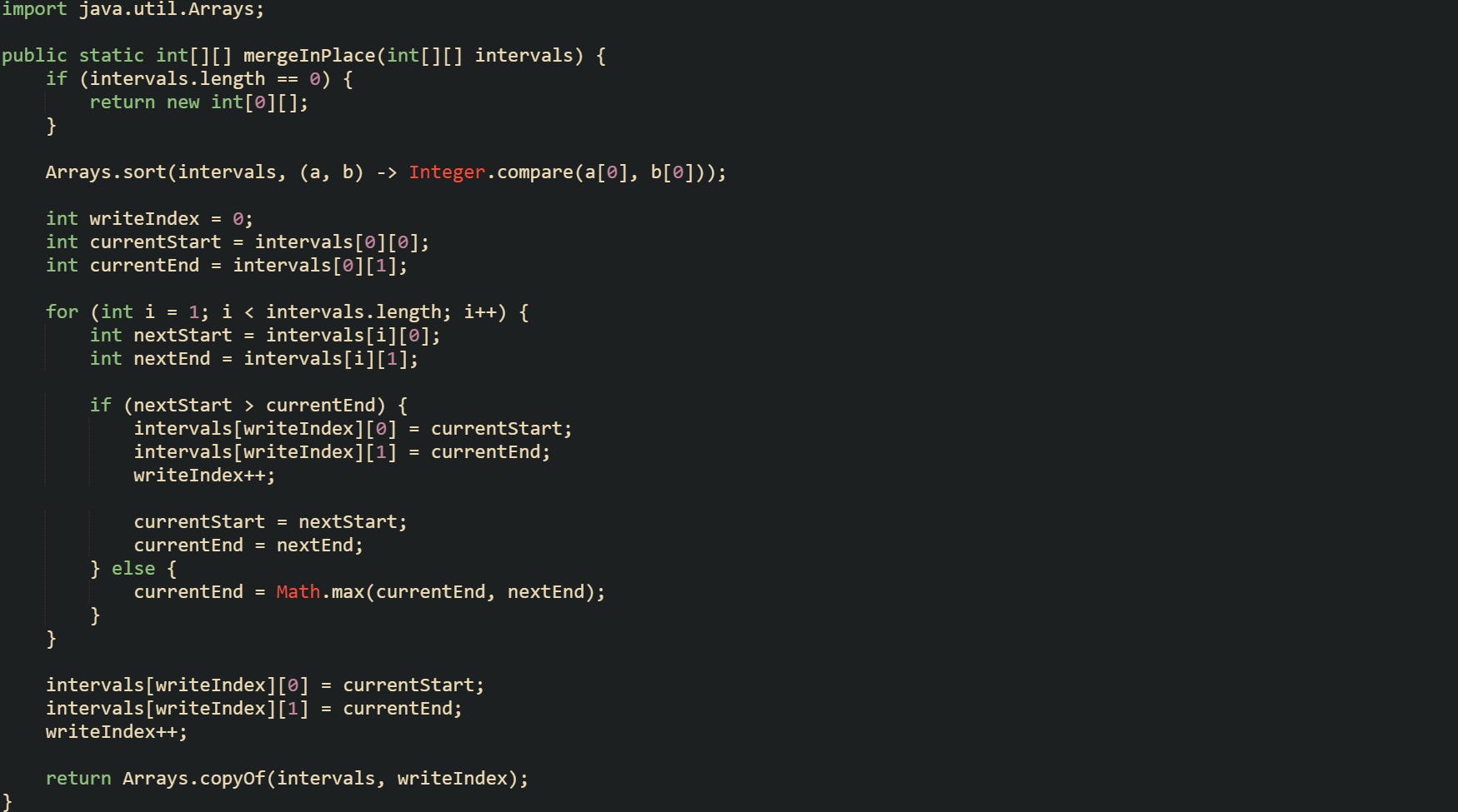 ![import java.util.Arrays; public static int[][] mergeInPlace(int[][] intervals) { if (intervals.length == 0) { return new int[0][]; } Arrays.sort(intervals, (a, b) -> Integer.compare(a[0], b[0])); int writeIndex = 0; int currentStart = intervals[0][0]; int currentEnd = intervals[0][1]; for (int i = 1; i < intervals.length; i++) { int nextStart = intervals[i][0]; int nextEnd = intervals[i][1]; if (nextStart > currentEnd) { intervals[writeIndex][0] = currentStart; intervals[writeIndex][1] = currentEnd; writeIndex++; currentStart = nextStart; currentEnd = nextEnd; } else { currentEnd = Math.max(currentEnd, nextEnd); } } intervals[writeIndex][0] = currentStart; intervals[writeIndex][1] = currentEnd; writeIndex++; return Arrays.copyOf(intervals, writeIndex); } import java.util.Arrays; public static int[][] mergeInPlace(int[][] intervals) { if (intervals.length == 0) { return new int[0][]; } Arrays.sort(intervals, (a, b) -> Integer.compare(a[0], b[0])); int writeIndex = 0; int currentStart = intervals[0][0]; int currentEnd = intervals[0][1]; for (int i = 1; i < intervals.length; i++) { int nextStart = intervals[i][0]; int nextEnd = intervals[i][1]; if (nextStart > currentEnd) { intervals[writeIndex][0] = currentStart; intervals[writeIndex][1] = currentEnd; writeIndex++; currentStart = nextStart; currentEnd = nextEnd; } else { currentEnd = Math.max(currentEnd, nextEnd); } } intervals[writeIndex][0] = currentStart; intervals[writeIndex][1] = currentEnd; writeIndex++; return Arrays.copyOf(intervals, writeIndex); }](https://substackcdn.com/image/fetch/$s_!jBNy!,w_2400,c_limit,f_auto,q_auto:good,fl_progressive:steep/https%3A%2F%2Fsubstack-post-media.s3.amazonaws.com%2Fpublic%2Fimages%2F3d307599-552d-4101-b5c0-ba9c80a37047_1749x975.png)