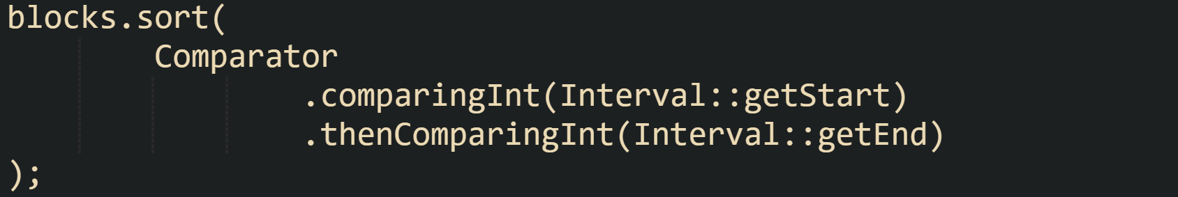 ![import java.util.ArrayList; import java.util.Comparator; import java.util.List; public class IntervalSortingDemo { public static void main(String[] args) { List<Interval> blocks = new ArrayList<>(); blocks.add(new Interval(5, 7)); blocks.add(new Interval(1, 3)); blocks.add(new Interval(2, 6)); blocks.sort(Comparator.comparingInt(Interval::getStart)); for (Interval interval : blocks) { System.out.println(interval); } // Output // [1, 3] // [2, 6] // [5, 7] } } import java.util.ArrayList; import java.util.Comparator; import java.util.List; public class IntervalSortingDemo { public static void main(String[] args) { List<Interval> blocks = new ArrayList<>(); blocks.add(new Interval(5, 7)); blocks.add(new Interval(1, 3)); blocks.add(new Interval(2, 6)); blocks.sort(Comparator.comparingInt(Interval::getStart)); for (Interval interval : blocks) { System.out.println(interval); } // Output // [1, 3] // [2, 6] // [5, 7] } }](https://substackcdn.com/image/fetch/$s_!zBKO!,w_2400,c_limit,f_auto,q_auto:good,fl_progressive:steep/https%3A%2F%2Fsubstack-post-media.s3.amazonaws.com%2Fpublic%2Fimages%2Fbff14e3d-c25b-46b2-b265-2638ad80428d_1786x806.png)
