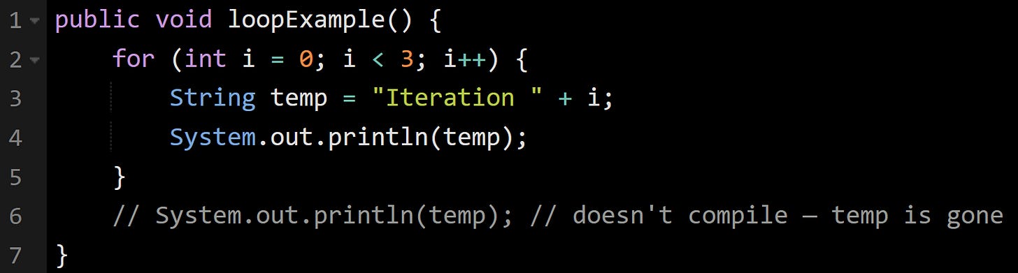 I remember trying to use a loop variable outside the loop and being confused when it couldn’t be found. Java sees that variable as part of the loop block, and it won’t let you use it anywhere else. You just have to plan for that.