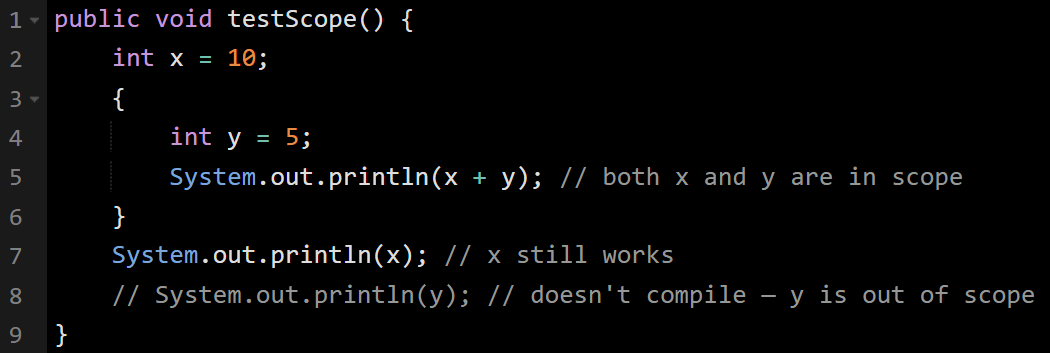 Today we will focus on the kind of scope you run into inside a method, how Java treats variables depending on where they’re written, and why wrapping something in {}