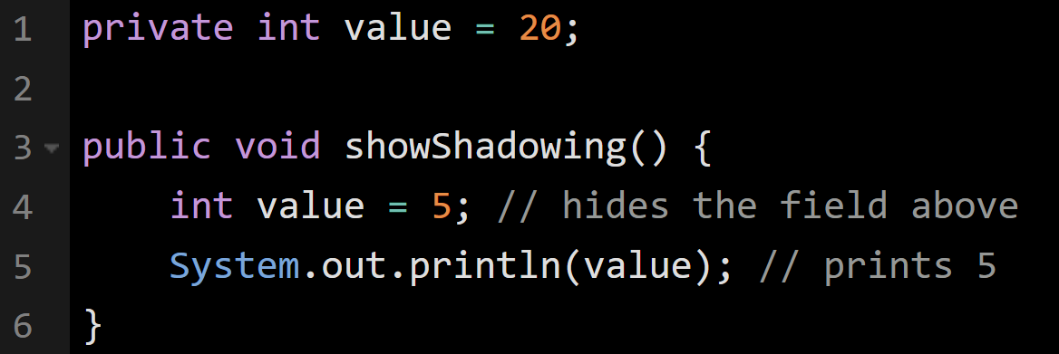 Java lets a local variable or method parameter hide a field with the same name, but it doesn’t let one local variable hide another inside the same method. Trying to redeclare the same name in a nested block produces a compilation error.