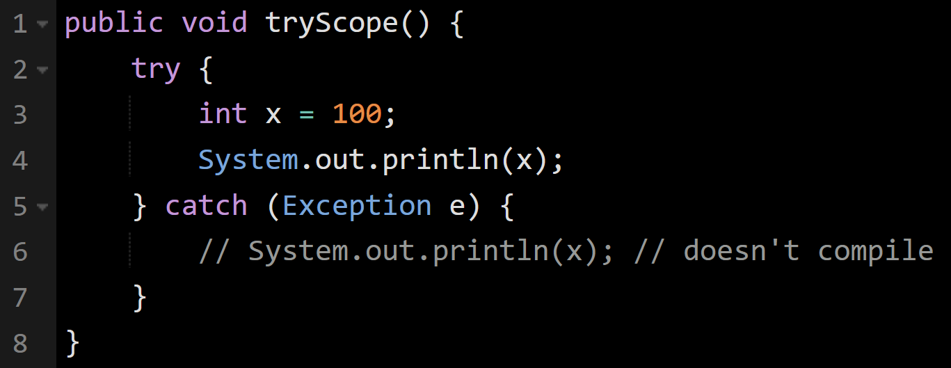 This came up for me while writing some code that handled a file read. I declared something in the try, and then couldn’t understand why it was out of reach in the catch block. Took me a few minutes to realize I needed to move the declaration outside the try if I wanted to use it in both places. The same thing goes for the exception itself, once the catch block ends, the exception variable goes with it.