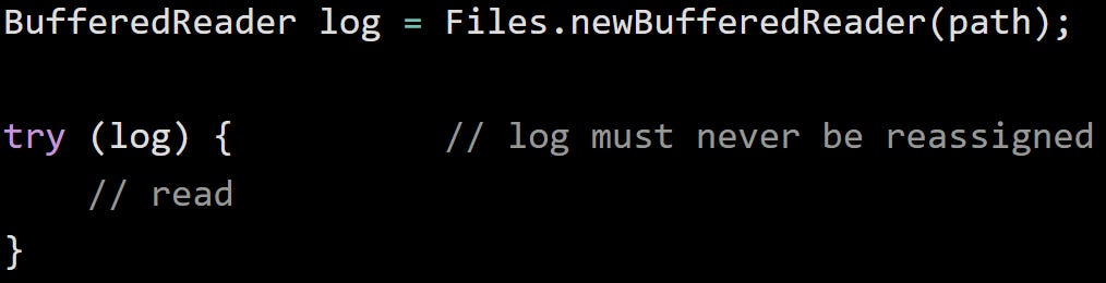 Before Java 9, the only way to use the resource header was to create something new inside it. Now you can pass in a variable, but there’s a catch. It has to stay unchanged.