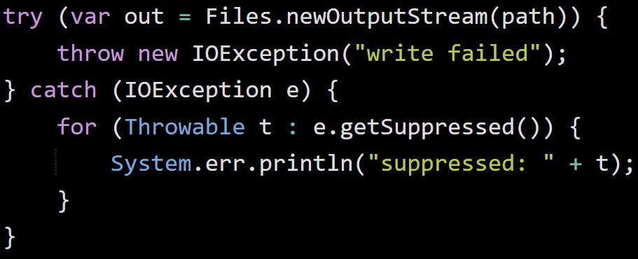 You don’t get direct scope access to both, but nothing’s lost. That second exception gets tucked away, and you can still pull it out during debugging. Java wants you to have the full story without needing extra tricks.