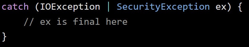blocks that handle more than one exception. When they do, Java gives you a shared variable, but it locks it down tight. That way, you don’t end up changing it and confusing what exception you’re actually dealing with.