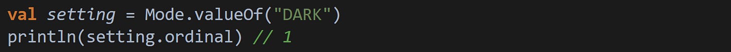 values come from the JVM’s enum system. Kotlin doesn’t handle them directly. They’re passed in automatically when each constant is created. Kotlin’s constructor parameters follow those built-in values.