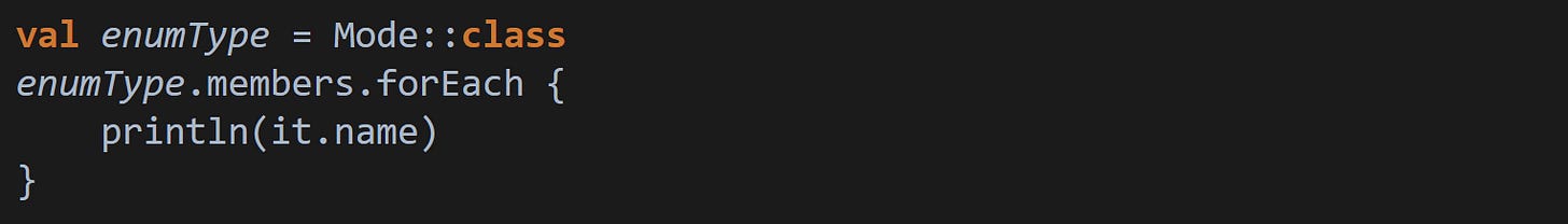 Reflection can reach enum constants in Kotlin, either through Kotlin’s reflection tools or Java interop. Both work, and both see the enum as a compiled class with static constants.