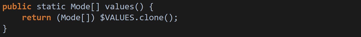 Both methods are added to every enum class, and the compiler marks them as static. These match the method signatures the JVM expects for enums. That keeps enum classes usable from Java and allows Kotlin’s code model to stay compatible with older libraries and tooling.
